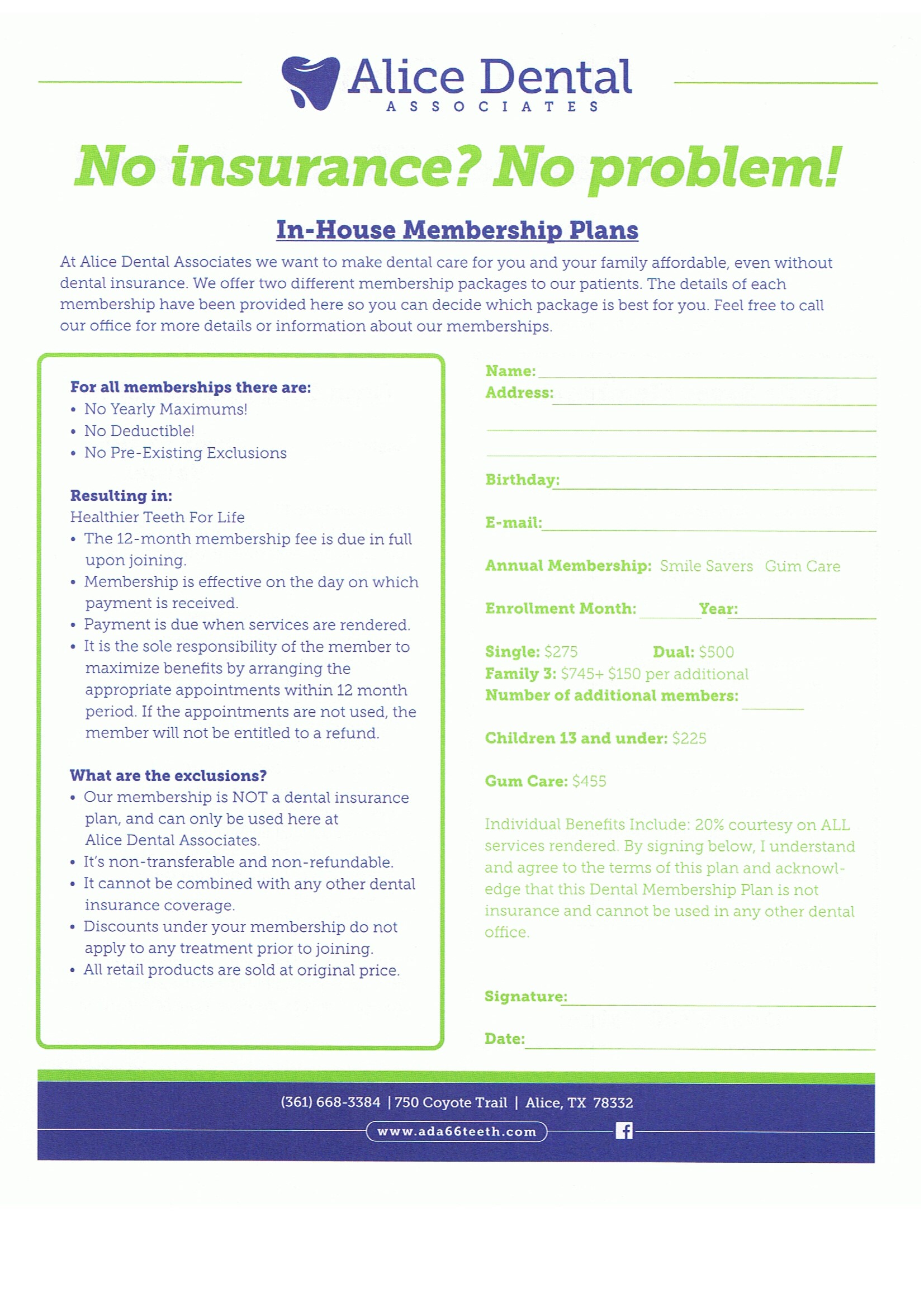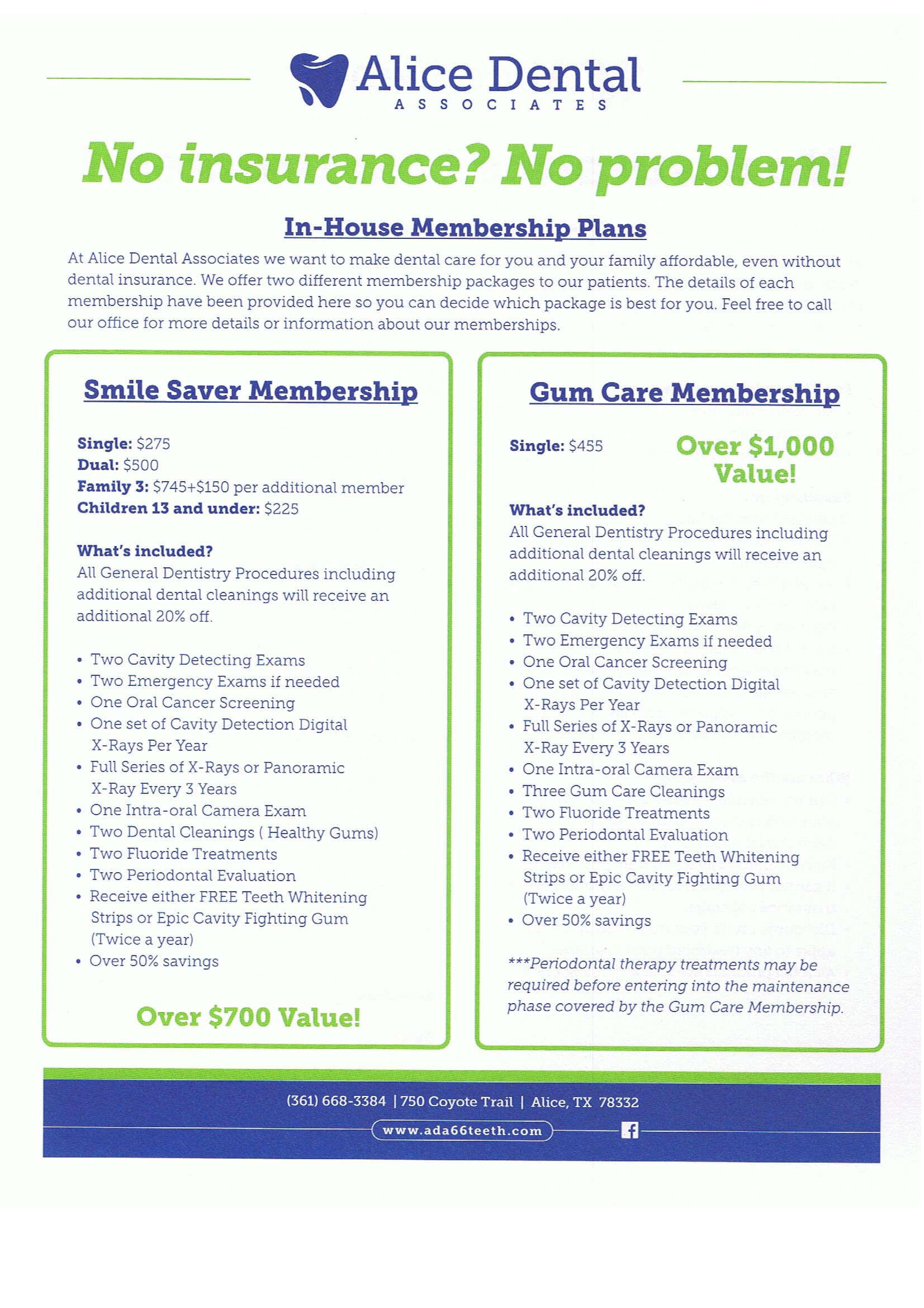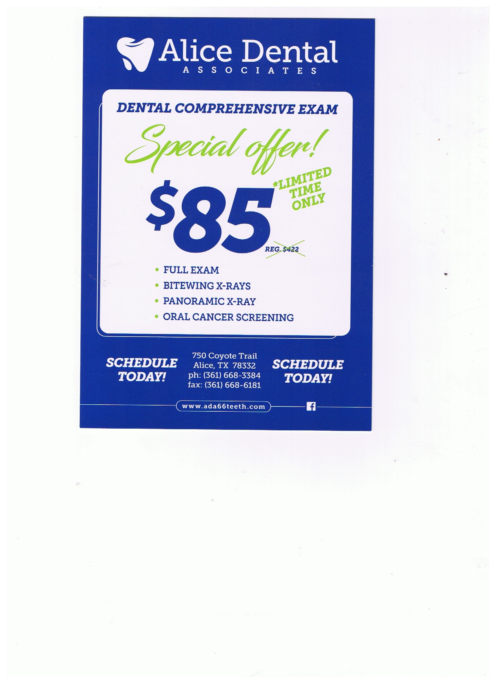 Contact UsAre you looking for a top-rated dentist in Alice? Visit Alice Dental Associates – Dr. Roel Garza and Dr. Jessica Garcia. We have been serving Alice and the surrounding communities since 1996 providing high-quality dental services for patients of all ages. From preventive, cosmetic and restorative dentistry to pediatrics, dentures and teeth whitening, we are here to meet all of your family’s dental needs. Call your Alice Dentist today at 361-668-3384 to schedule an appointment.